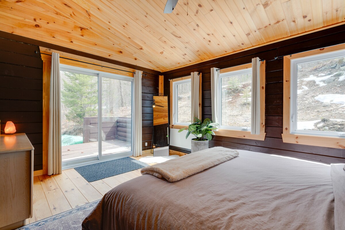 Chalet en pleine nature avec vue sur la montagne. Spa extérieur couvert ouvert à l’année, foyers au bois intérieur et extérieur, planchers chauffants et BBQ. Cuisine complète avec café inclus. Trois chambres : suite des maîtres avec lit king et foyer au gaz, 2e chambre avec lit queen et mezzanine avec lit queen. Terrain de 5 acres avec 2e phase locative prévue en 2026. Parfait pour vous ressourcer. No enr. 309551 exp. 2026-06-08.