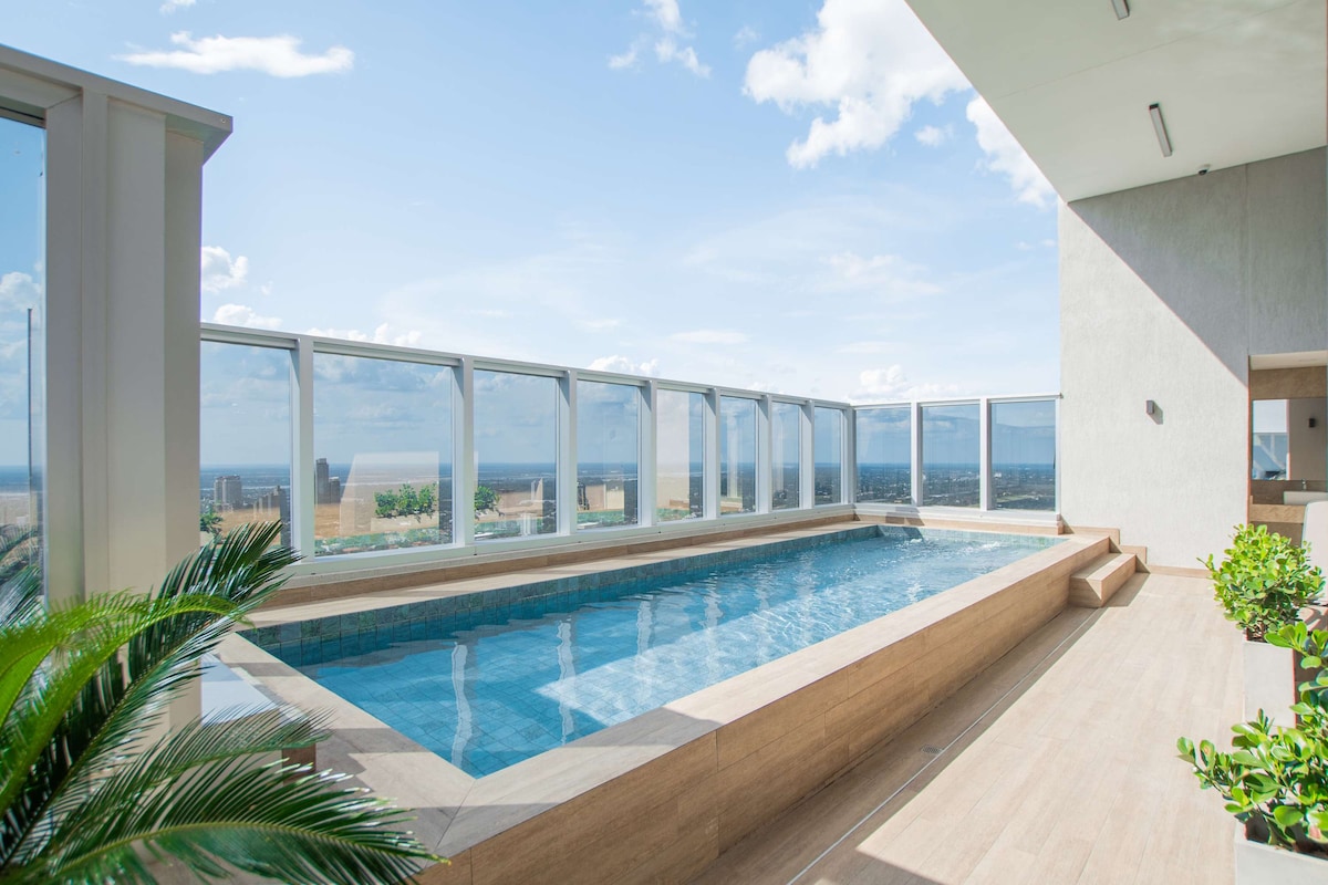 Departamento ubicado en un piso alto, con balcón y vista despejada, totalmente equipado para una estadía cómoda: - Cama king con colchón firme de alta densidad - Espacio de trabajo con escritorio y conexión WiFi - Smart TV de 55'' - Rooftop con piscina y gimnasio - Quincho - Lavandería - Seguridad las 24 horas Ubicación excepcional: - Situado en el Eje Corporativo, a solo 5 minutos del Shopping del Sol y Paseo La Galería - A 15 minutos del Aeropuerto Internacional Silvio Pettirossi