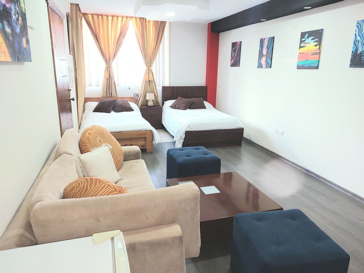 Moderno loft piso 21, edificio nuevo con generador de luz autónomo, ideal para viaje de negocios o para una ocasión especial, vista única de la ciudad. Ubicación privilegiada en el centro norte de Quito junto al parque La Carolina, además a tan solo unos pasos encontrarás centros comerciales e instituciones financieras. El servicio incluye parqueadero, wifi, cine en casa, tina de baño, agua caliente, lavadora/secadora comunal, elementos de higiene, gimnasio y piscina.