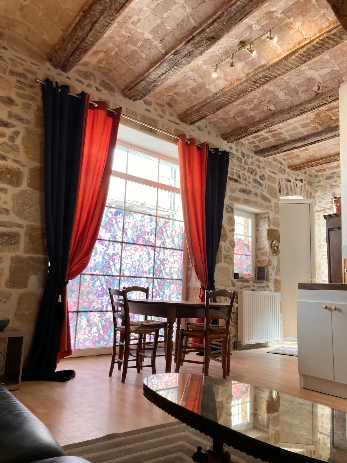Situado en la planta baja de la casa, ubicado en una antigua bodega abovedada, la casa rural sigue siendo fresca en verano. La cabaña tiene una gran sala de estar con almacenamiento, cama 140/190 (sábanas y toallas incluidas). Un sofá cama, una cocina equipada con vitrocerámica, campana, nevera, nevera, microondas, cafetera de filtro, hervidor de agua. Baño con ducha e inodoro separado. Panadería a 200 metros, supermercado y restaurante a 30 metros, cerca del centro de la ciudad.