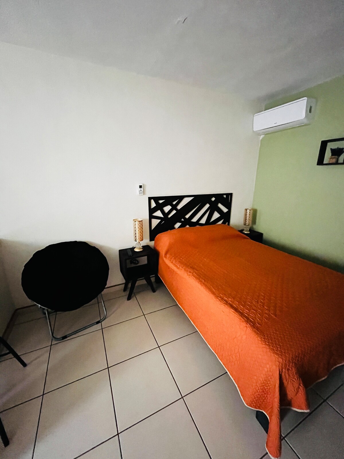 Cómodo departamento para una estadía agradable. Cuenta con buena iluminación y ventilación. Ubicado frente a unidad deportiva. Lugares cercanos; gimnasio, tiendas de abarrotes, centro de salud, farmacia, lavandería, puestos de comida y paraderos de camión. Entradas y salidas rápidas hacia las distintas carreteras. Cuenta con: Habitación con cama kingsize y A/C. Sofacama. Cocina con parrilla y frigobar (con enseres básicos para cocinar). Agua caliente por medio de calentador solar.