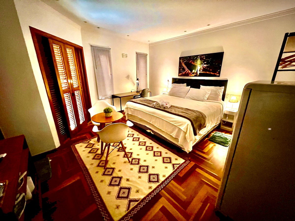 Estudio completo con cama doble, cocina y espacio de estacionamiento. Ideal para parejas o personas solteras, con excelente costo-beneficio en la zona. Vista de un acogedor jardín y wifi gratis. A 05 minutos en auto del Autódromo de Interlagos, cerca de las estaciones CPTM Autodromo y Jurubatuba, Mercado, Mc Donalds, Farmacia, Hortifruti, etc. Junto a Sesc Interlagos y la presa Guarapiranga para kayak, moto acuática, vela, etc. Nota: Lamentablemente, no aceptamos petz.