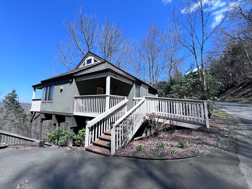 Enjoy your mountain escape at 3,700 ft elevation with resort amenities. This cozy 2 bed 2 bath home offers a peaceful setting bordering protected land. Inside you will find gas heat to keep warm, fully equipped eat in kitchen with a large desk to work remotely & Split bedroom setup. Den has sliding door to covered deck. Enjoy the back covered deck, with a patio table and chairs, a grill and a wooded view. Community amenities: seasonal pool, beach/lake, golf course, game room, river, trails.
