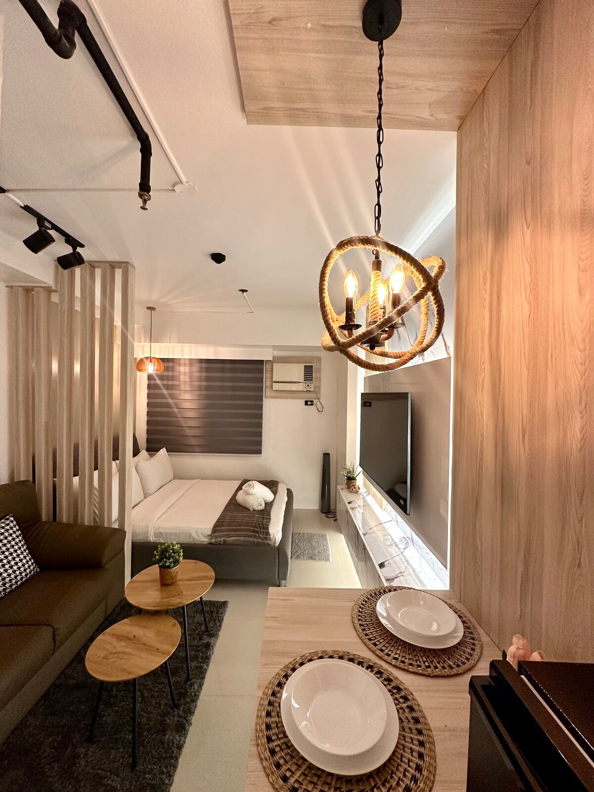 ¡Bienvenido a este acogedor estudio en Quezón City, tu refugio perfecto! El espacio cuenta con una cómoda cama doble, un televisor inteligente de 55 pulgadas con Netflix, Disney+ y HBO Go, junto con un sofá reclinable, una cocina compacta pero totalmente equipada y una elegante sala de estar perfecta para relajarse después de un día de exploración. Con cafeterías, restaurantes y atracciones a solo unos pasos, ya sea que estés aquí por negocios o por placer, este estudio promete una estancia encantadora en el corazón de la ciudad.