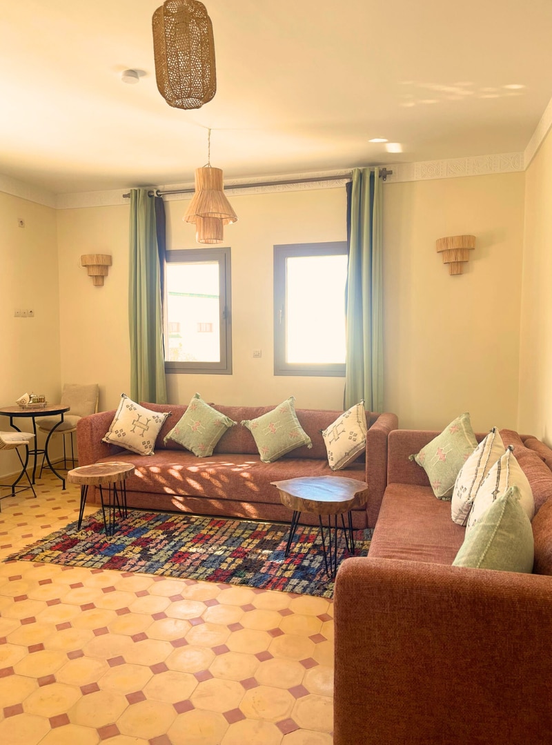 This one-bedroom apartment is perfect for solo travellers, couples, and surfers. The apartment is decorated with a minimalist style and features a spacious bedroom with a queen-size bed and ample storage space. The living room is bright and airy with 2 sofa beds, TV and kitchenette. The apartment is located in the heart of Tamraght, near "Hey Yallah Cafe" Walking distance from Devil's Rock, and a variety of shops, cafes & amenities