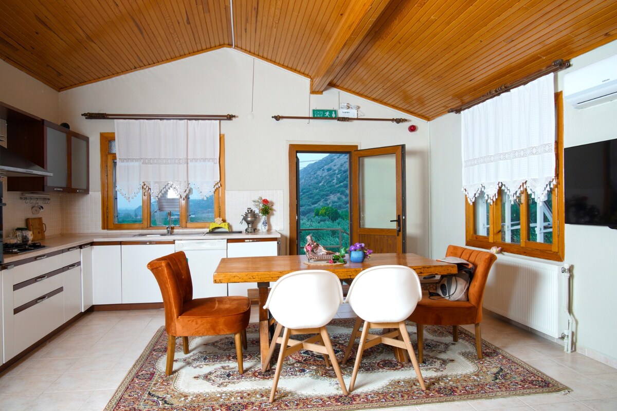 En la fachada de nuestra villa, que está apoyada en las laderas de Tavşantepe cubiertas de olivos, podrá disfrutar de la paz viendo todos los tonos de verde en nuestra piscina (agua salada), piscina de spa, nogales y olivos y varios árboles frutales. Mientras que los sonidos de los gallos, pollos, ruiseñores y ardillas acompañan sus mañanas, las golondrinas le ofrecerán un espectáculo visual con sus bailes por las tardes.