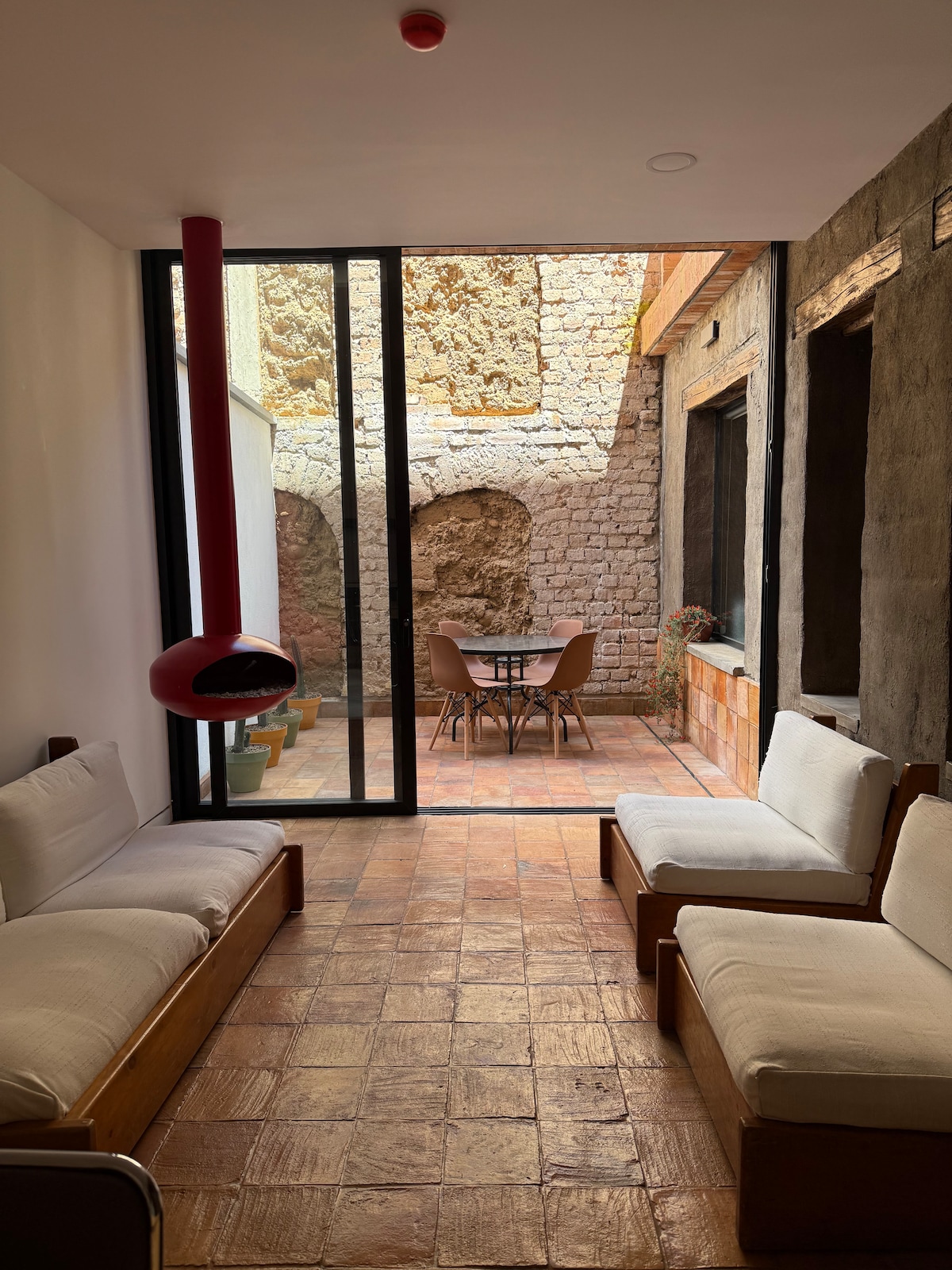 Absorba la relajante luz y calidez que penetra todo el espacioso ambiente a travez de las grandes ventanas y tragaluces. Relájate debajo de unos amplios cielos raso de 3 metros en las habitaciones y uno abovedado de 6 metros en la cocina abierta estilo americano. ⚡️ agua caliente, Wi-Fi y luz para tus dispositivos las 24/7 gracias al sistema de baterías de respaldo. Ojo: algunos electrodomésticos de alto consumo, cómo el secador de pelo y la tetera, no funcionan durante los cortes de energía.