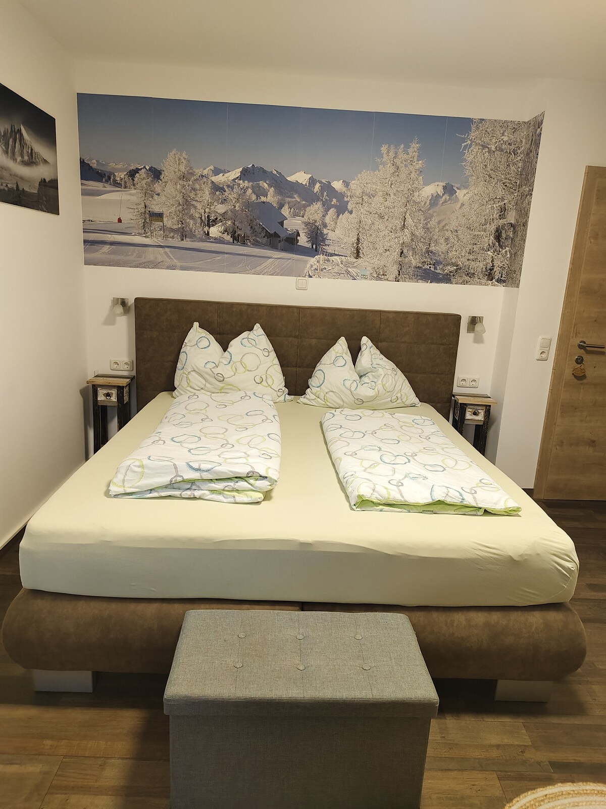 Alojamiento amueblado moderno de 120 m² con 4 habitaciones para hasta 12 personas (3 camas tamaño king, 6 camas individuales). Tres habitaciones con lavabo, dos con terraza y vistas a la montaña. Ideal para familias y grupos que quieran disfrutar de la paz y la naturaleza. Las rutas de senderismo comienzan justo en la casa, la zona de esquí está a solo 15 minutos. La sauna, la piscina y el jardín se pueden utilizar dependiendo de la temporada. Desayuno incluido. Aparcamiento 5 €/noche, tasa turística 3 €/persona/noche. ¡Relajación y vacaciones activas en la montaña!