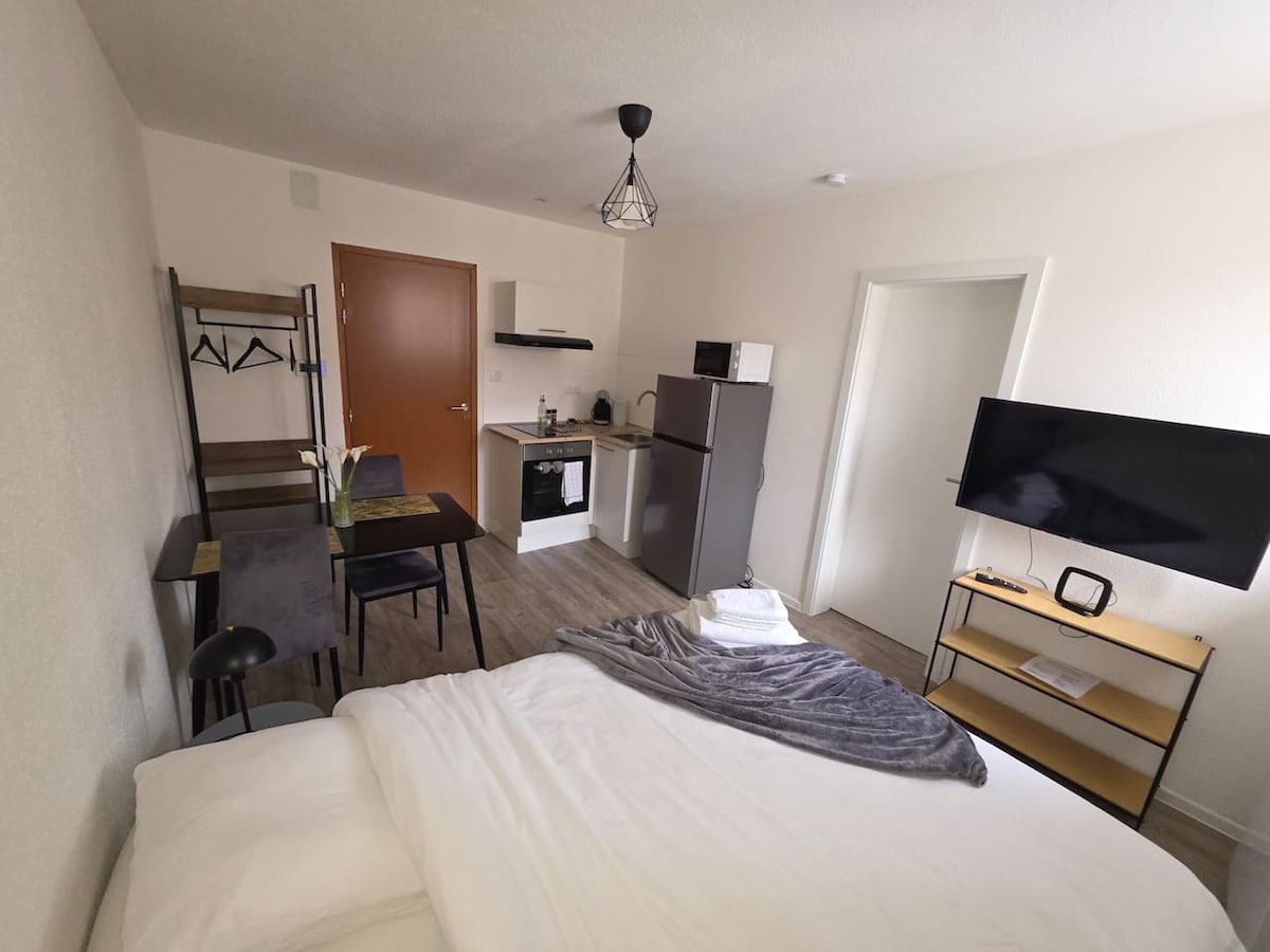 Fully renovated 1BR apartment steps from Basel Tram 3 (Soleil) – just 20 min to downtown Basel! St. Louis train station is 5 min away with shuttle bus 11 direct to Basel–Mulhouse Airport (€3). Walk 1 min to local restaurants or 10 min to St. Louis center with shops & dining. Carrefour Express supermarket nearby. Free street parking included – perfect for travelers seeking comfort, convenience & easy airport access.