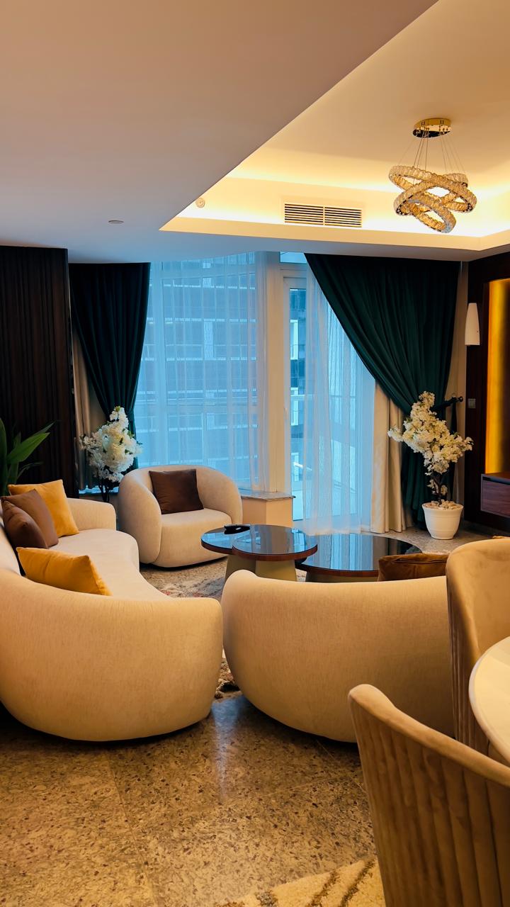 El apartamento ofrece una vista directa al Nilo y es muy espacioso. Incluye un gran salón, tres dormitorios grandes, una cocina totalmente equipada y tres baños con elementos esenciales como jabón, champú y toallas desechables. Hay una amplia zona de aparcamiento frente al edificio y está cerca de restaurantes, panaderías y tiendas como Othaim y Panda. El edificio cuenta con dos ascensores y hay servicios de taxi o Uber disponibles justo en la entrada, bajo petición.