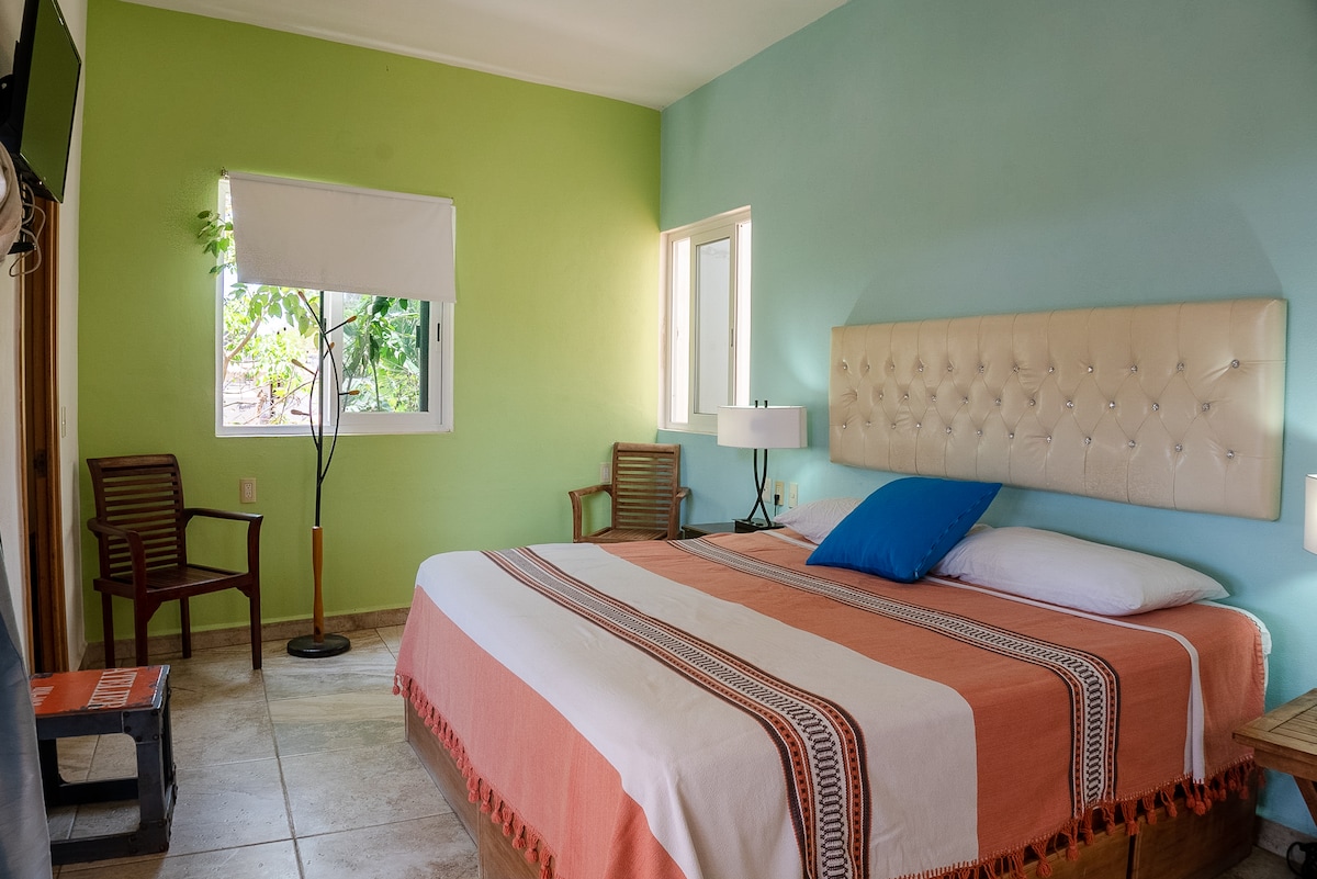Loft RÚSTICO DE PALAPA AL AIRE LIBRE; vistas inmejorables; sin aire acondicionado ni pantallas; selva tropical. A 2 minutos caminando de una amplia y tranquila playa. Sillas de playa/sombrilla, Wifi, servicio de limpieza, caja fuerte, piscina de inmersión de jacuzzi compartida, cámaras de seguridad, LR, bar, cocina pequeña, bañera/ducha, segundo loft superior, gatos residentes. Dormitorio queen. Mosquitera, ventiladores, brisa marina, repelente de insectos. A 6 minutos a pie de playa o calle a restaurantes. Si es sensible a los insectos, considera la suite África de Calabaza con aire acondicionado, mosquiteros y puertas.