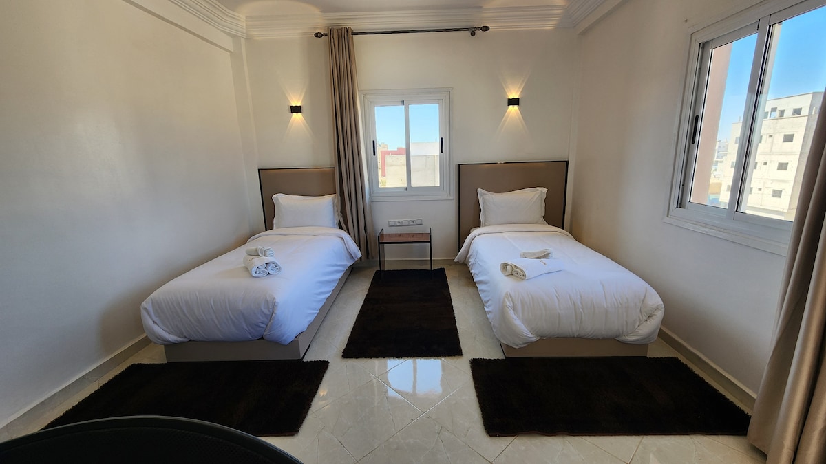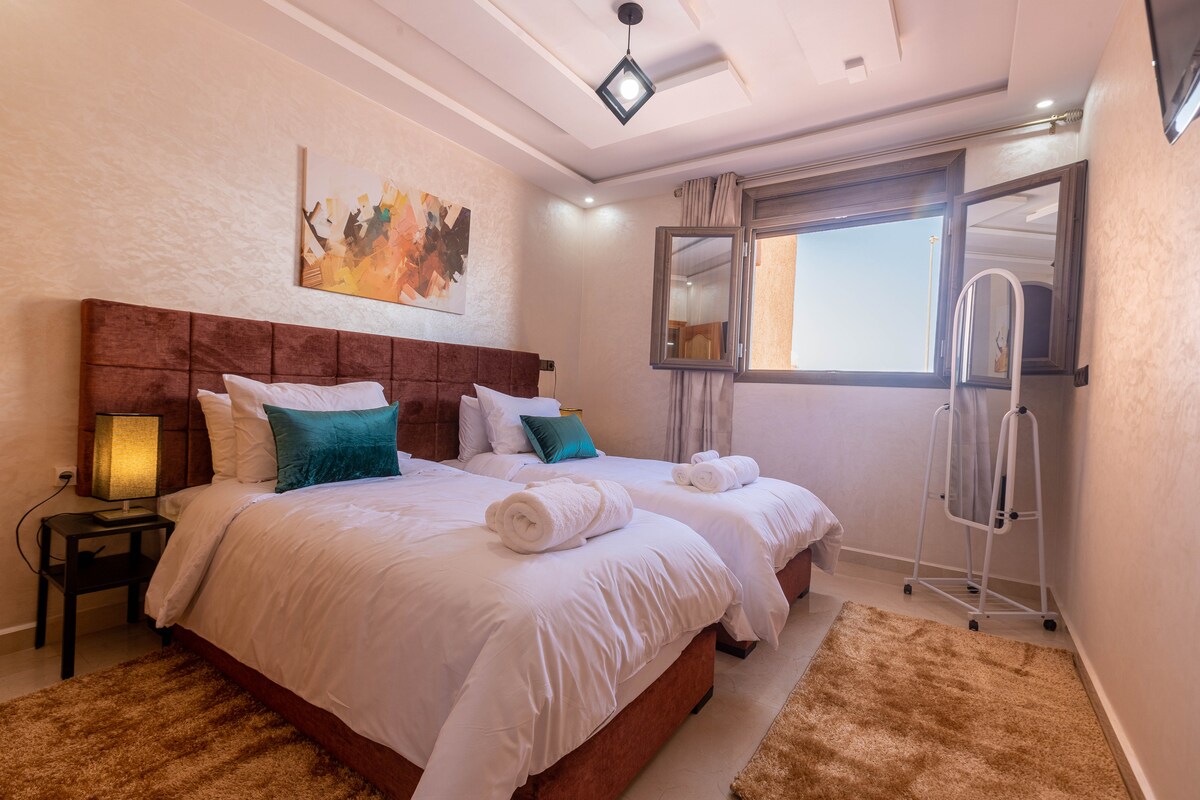 Vuela, relájate, repite... y hazlo con estilo. Este moderno apartamento de diseño de 2 dormitorios es tu base perfecta en Dakhla. A pocos minutos de la laguna, ofrece habitaciones luminosas, una cocina totalmente equipada, wifi rápido y una acogedora sala de estar. Ideal para kitesurfistas, parejas o trabajadores a distancia. Cerca de cafeterías, mercados y playas. Relájate cómodamente después de un día de viento y olas. ¡Tu escapada a Dakhla comienza aquí!