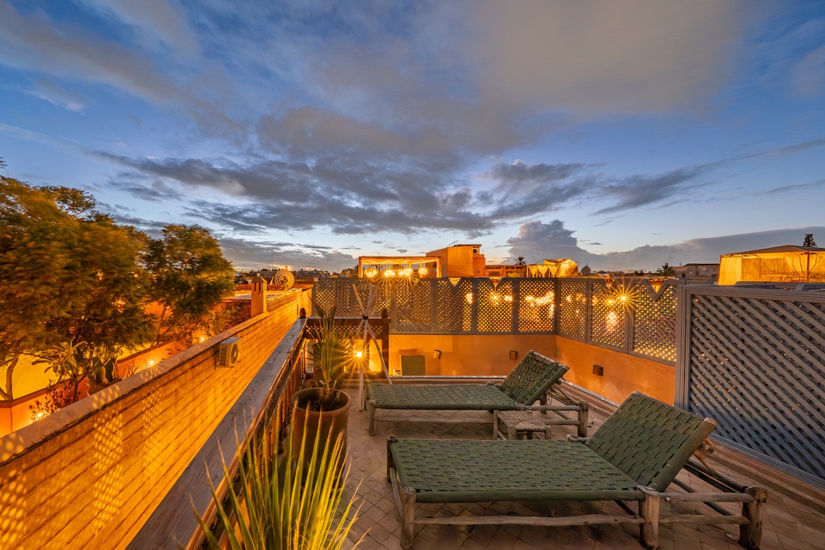 ✨ Stay in our authentic 3-level Riad (80 m²) in the heart of Marrakech. Enjoy a charming patio with fountain, kitchen, dining area, small lounge, guest bathroom, and a bedroom with en-suite on the ground floor. ✨ Upstairs, relax in a second bedroom with private bathroom, plus a reading & TV corner. ✨ End your day on the rooftop terrace, arranged as a summer lounge perfect for sunbathing or magical evenings under the stars. ✨ Comfort, tradition, and Moroccan hospitality await you