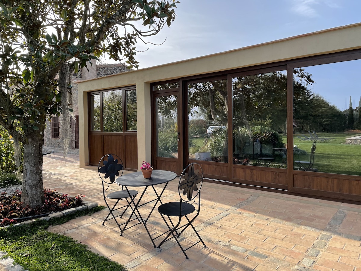 Alojamiento único en el corazón del Empordà, muy cerca de las playas y los pueblos más bonitos de la zona. Apartamento de invitados con entrada independiente desde la calle. Con dos plantas, con cocina, comedor y sala de estar en planta baja, y dormitorio con aseo en planta superior. Jardín, piscina y barbacoa se comparten con la finca principal (propietarios de la finca) El espacio està adecuado para dos adultos. No es adecuado ni para niños ni para bebés.