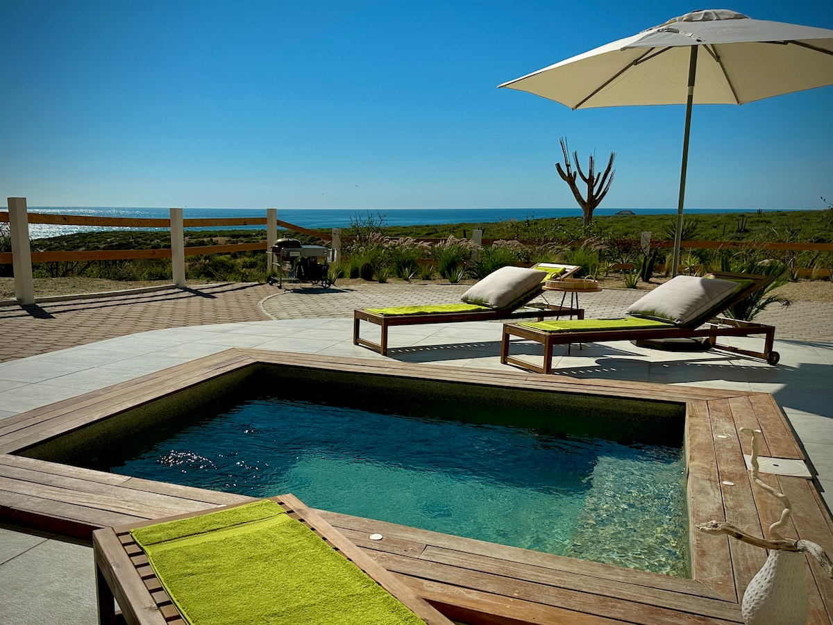 Esta impresionante casa de playa en Cerritos cuenta con amplias terrazas, fogatas, zonas de yoga y una piscina climatizada de 10 pies de profundidad con una plataforma para tomar el sol. Relájate en el jacuzzi de la azotea, en la piscina de inmersión fría o en la sauna, y disfruta de cocinas y comedores interiores y exteriores, completos con hamacas. A pocos pasos de la playa, tiendas de comestibles, bares y restaurantes, puedes explorar la vibrante zona o relajarte en tu santuario privado en el desierto. Disfruta de la comodidad y la elegancia en esta serena escapada a Baja California, ¡donde irse es opcional!