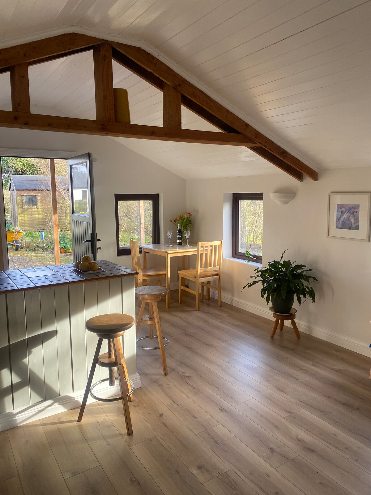 ¡Saludos desde las colinas de Sligo! Nuestra propiedad es un espacioso y moderno apartamento tipo estudio en el primer piso adyacente a nuestra casa familiar. Está totalmente amueblado con un alto nivel de comodidad. Luminoso y espacioso, con una hermosa vista sobre el bosque de madera dura maduro, está ubicado en una granja de ovejas en funcionamiento. Se encuentra a 10 minutos en coche de la ciudad de Sligo, a 3 minutos del Castledargan Hotel and Golf Course y a 5 minutos del Castillo de Markree, con fácil acceso a paseos por tierras altas y bosques, y playas de renombre mundial.