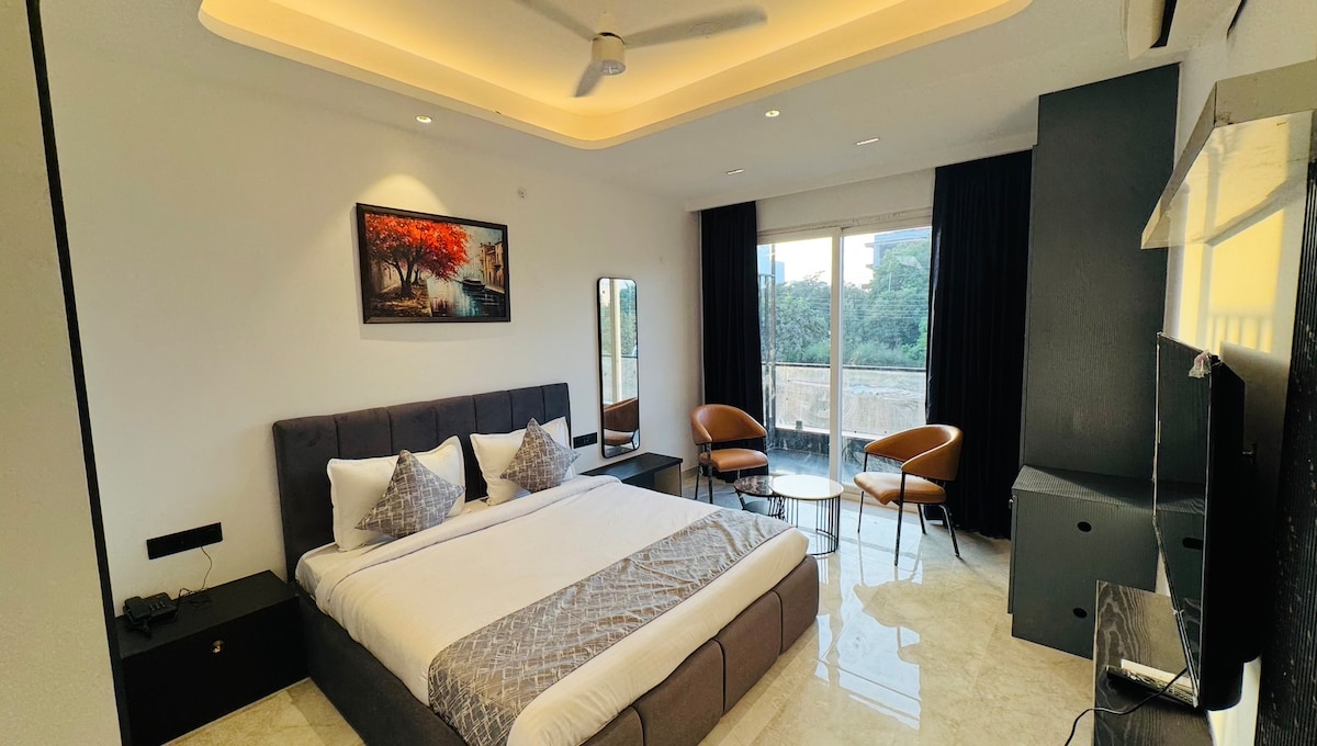 Indulge in a luxurious stay at Bloom Central, where modern elegance meets comfort. This stylish 1BHK features a chic open kitchen, a private balcony, and exclusive access to premium amenities including a serene pool and secure parking. Perfectly located in the heart of Gurgaon, it offers an upscale retreat for guests seeking sophistication, convenience, and a truly elevated experience.