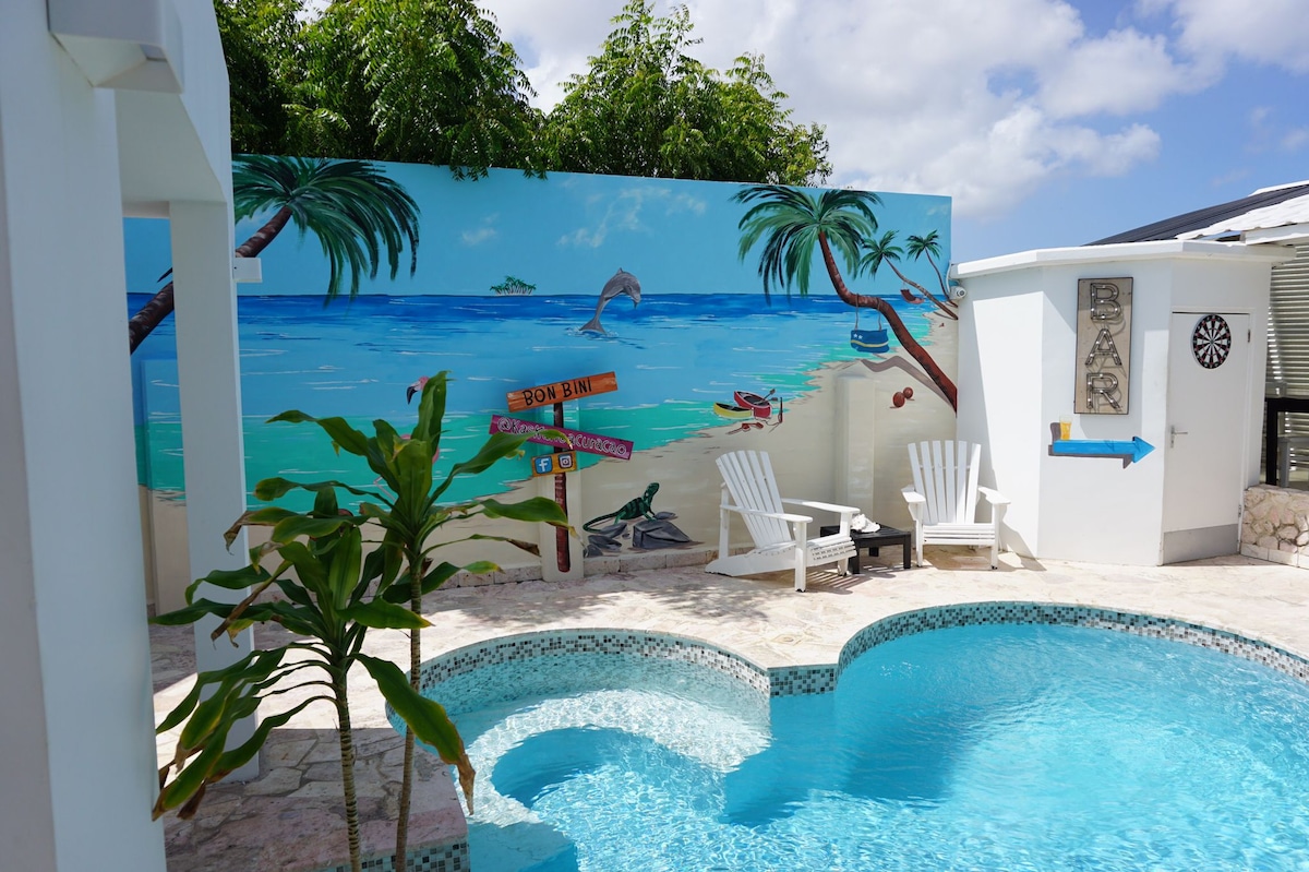 Si has soñado con una villa privada asequible con vistas increíbles, piscina y acceso a una playa privada, no busques más. Villa Bon Bini se encuentra en la parte más alta de la colina con vistas al mar en el centro vacacional Cas Abou. Está escondida, rodeada de un exuberante jardín tropical. La casa está totalmente equipada con todo lo necesario para pasar largos días de relax junto a la piscina con amplias vistas al mar.