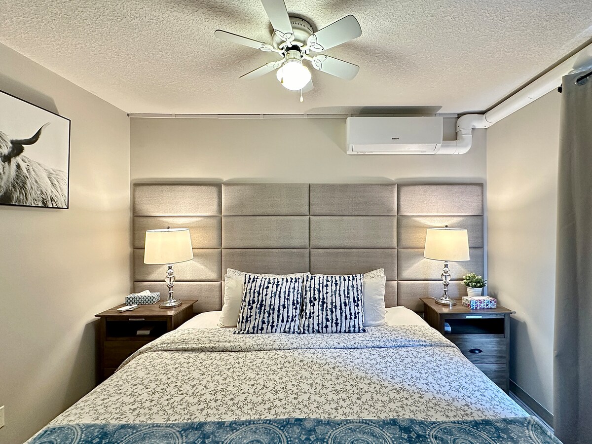 Newly installed Split A/C in both living & bedroom Located in the heart of beautiful Canmore town, easy to access with 1 assigned parking stall, close to hiking and biking trails, grocery stores, restaurants This beautiful one king bedroom suite features a fully equipped kitchen, ensuite laundry, 1 queen sofa bed, private balcony with BBQ, infloor heating, located on the 2nd floor. Newly equipped public gym Only an hour away from Calgary and minutes away from the gate of Banff National Park