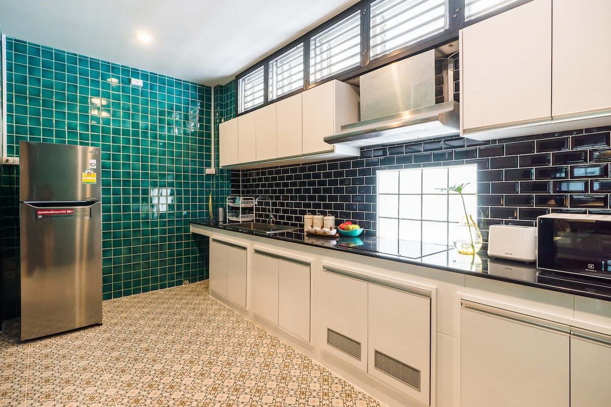 Increíble casa retro que puede alojar cómodamente hasta 5 personas e incluye 3 dormitorios, 2 baños, cocina, patio jardín y una gran sala de estar. La casa está situada en una calle tranquila, pero muy cerca de los mejores restaurantes locales e internacionales, cafeterías, bares divertidos y la zona comercial que BKK tiene para ofrecer. BTS: a 5 minutos de la estación de 🚗 Ekkamai. Calle Thonglor EmQuartier EmSphere Feria Jodd Café Thieves Centro comercial DonDonki Supermercado Big C Restaurante de marisco Here Hai Spa y bienestar White wood green