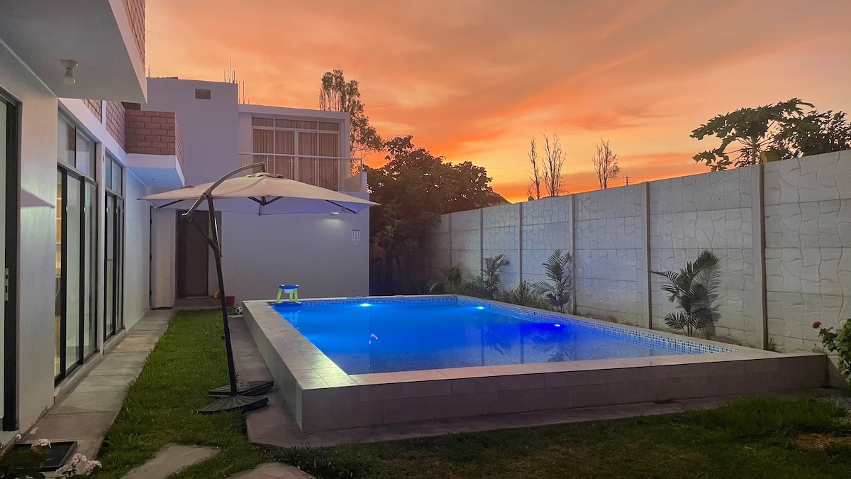 Diviértete en este alojamiento con estilo. Disfruta de la tranquilidad de vivir cerca al mar. Un lugar donde compartir con toda tu familia y amigos. Disfruta de nuestra piscina con hidromasaje y luces LED . Piscina temperada tiene costo adicional en época de verano (S/.100 adicional por noche a partir de 15-Noviembre ) consultar antes .