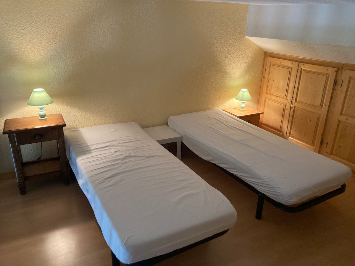 Buenos días, Hola, Hallo, Estamos alquilando un piso de 538 pies cuadrados, recientemente renovado, totalmente equipado con techo inclinado, en el último piso de un chalet independiente ubicado en las alturas de una tranquila aldea. Incluye una gran terraza , estacionamiento, 2 camas tamaño king (5,25 pies) y disfruta de una hermosa vista sobre las montañas. Vivimos entre Jausiers y Barcelonnette. Es una ubicación perfecta para esquiar, hacer senderismo, disfrutar de las festividades de Barcelonnette o el lago de Jausiers. Ropa de cama incluida. Esperamos verte pronto.