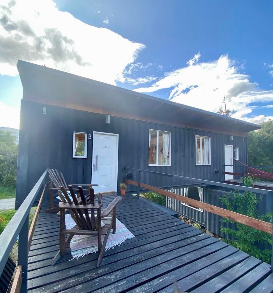 Casita reciclada de contenedor marítimo 5 cuadras de el centro y del súper cafés bares restaurantes y la feria artesanal. Sobre el pie de la montaña con un bosque nativo en el patio trasero desde donde se puede acceder al cerro amigo en un hike de 20 minutos . Las casitas están completamente equipadas y hay estacionamiento disponible en la entrada . El Barrio cuenta con un portón de segurigad y la calle es sin salida . Es muy tranquilo y a pasos del centro . ❤️🌳🌍