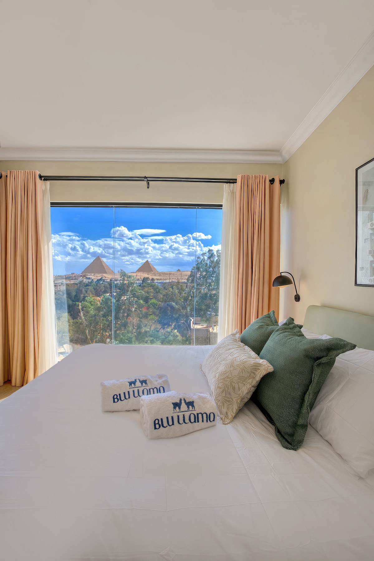 Stay in the heart of Giza with breathtaking views of the Pyramids and the Grand Egyptian Museum, visible right from your balcony. Located on a high floor, the apartment is quiet and peaceful, with modern design blended beautifully with ancient touches. The building has two elevators, and downstairs you’ll find a hypermarket, bakery, and groceries. Easy to reach and close to all major attractions, this is the perfect mix of comfort, history, and convenience.