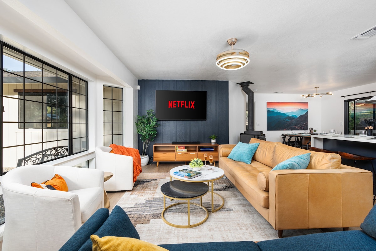 Immerse yourself in the allure of our Sunlight Cabin—a mid-century modern retreat boasting an array of amenities for your pleasure. Enjoy leisure in a peaceful environment that includes a hot tub, a fully functional kitchen, a designated office area, and a ton of entertainment options like a dartboard, ping pong, pool table, and board games. Nestled on a sprawling acre of land in a serene neighborhood, revel in panoramic views of the surrounding mountains that encapsulate your stay.