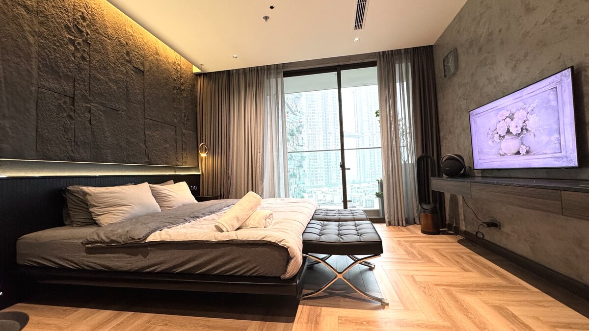 Disfruta de un lujo de 5 estrellas en este elegante estudio en tonos grises, con un baño con paredes de cristal, detalles en piedra natural y acabados de primera calidad. Perfectamente situado en el corazón de Ecopark, a solo 3 minutos del lago de los Cisnes y a 30 minutos del casco antiguo de Hanói, con restaurantes, cafeterías y tiendas justo a la vuelta de la esquina. Equipado con ventilador Dyson, altavoz Bluetooth y comodidades modernas; además de acceso al gimnasio y la piscina en el tercer piso, perfecto para una estancia elevada.