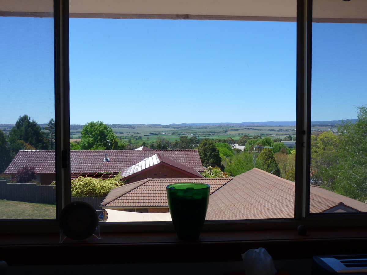 My home is in a leafy, quiet & elevated part of Bathurst with sweeping views from living areas & veranda. It is a short drive to the CBD and the famous Mount Panorama. Bathurst 1000 & events please enquire for rates. Minimum booking is for 4 persons & 4 nights. Enquire for rates & special offer. Enquire to check for early check in, blocked dates, or special offer. Down stairs - queen with large bathroom & large room - 2 king singles & day bed. Upstairs - 1 double & 1 king single beds.