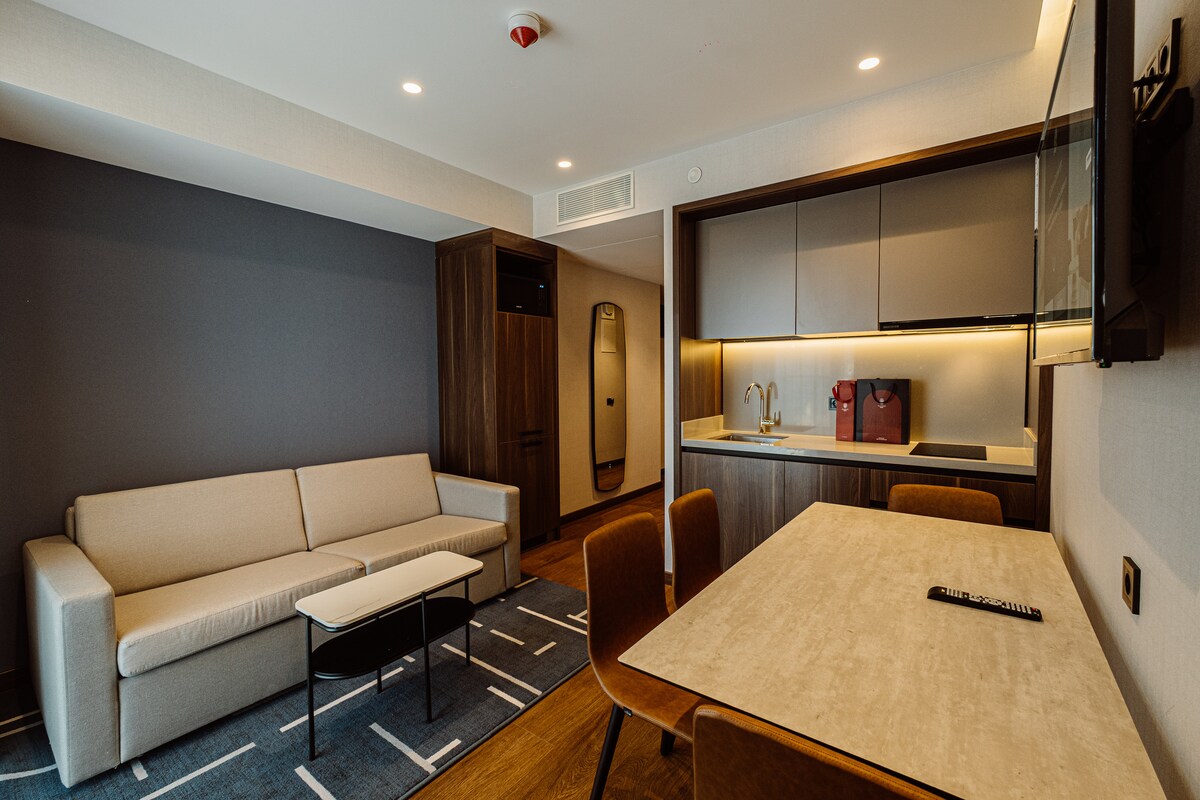 Apartamento de lujo en la planta 16 en el mismo edificio del hotel Marriott. Un dormitorio y una sala de estar con zona de cocina. Excelente insonorización. Renovación de alta calidad. La ventana ofrece unas vistas impresionantes del mar, la puesta de sol, el lago y las fuentes cantantes. Hemos instalado un nuevo televisor inteligente de 55 pulgadas en el apartamento. Llegada sin contacto. ¡Wi-Fi gratis! ¡Un set de regalo de aperitivos y artículos de tocador! El edificio cuenta con un lujoso restaurante con desayuno bufé. La entrada cuesta 40 gel.