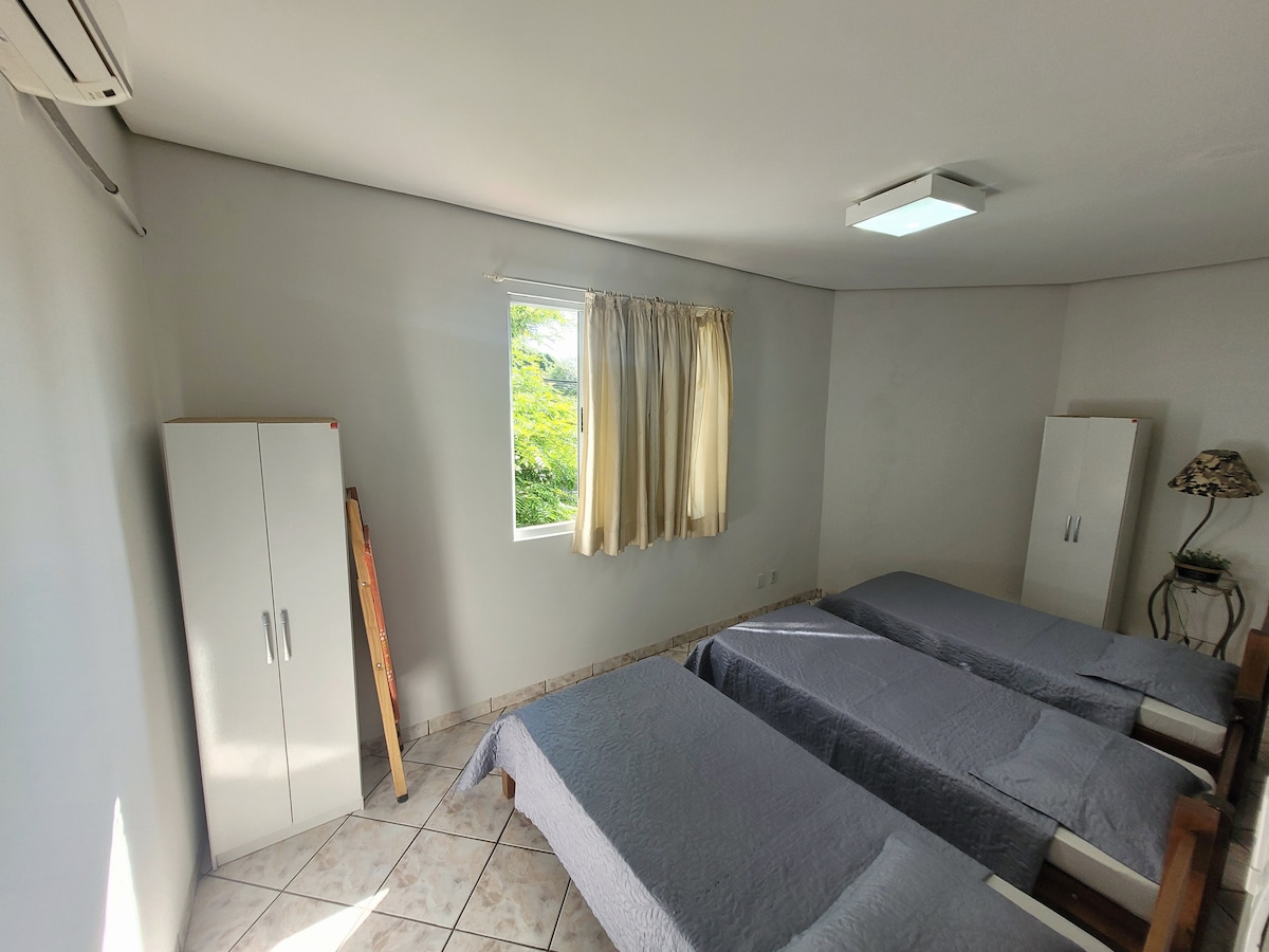 Alójate en una propiedad acogedora, con entrada privada y ambiente privado, garaje (para coches pequeños y medianos). Ambiente privado, con aire acondicionado. Si es necesario, podemos instalar una cama supletoria, solo tienes que seleccionar 3 personas y la tarifa ya está incluida. Ubicación privilegiada : A 2 cuadras de un hipermercado A 2 cuadras de dos famosas panaderías A 1 manzana de 3 pizzerías A 2 minutos del centro A 5 cuadras de Habib's y McDonald's A 5 minutos (en coche) de USP y CPO, SENAI, Centrinho.