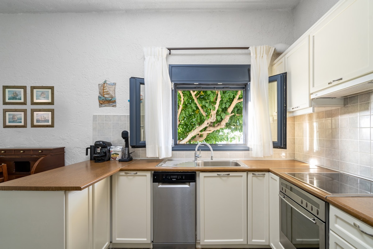 ¡Bienvenido a la villa de tus sueños, construida en contacto con una formación rocosa! Esta residencia ofrece dos dormitorios con baño privado. (1 con sofá cama adicional) La villa está situada en una parcela de 6000 m2 llena de pinos y olivares. Varios escalones conducen a tu playa aislada. La cocina y el comedor en el aithrio cuentan con vistas panorámicas al mar. Los espacios al aire libre de 120 m2 incluyen una sala de estar protegida por una pérgola sombreada, tumbonas, un comedor al aire libre, barbacoa, ducha