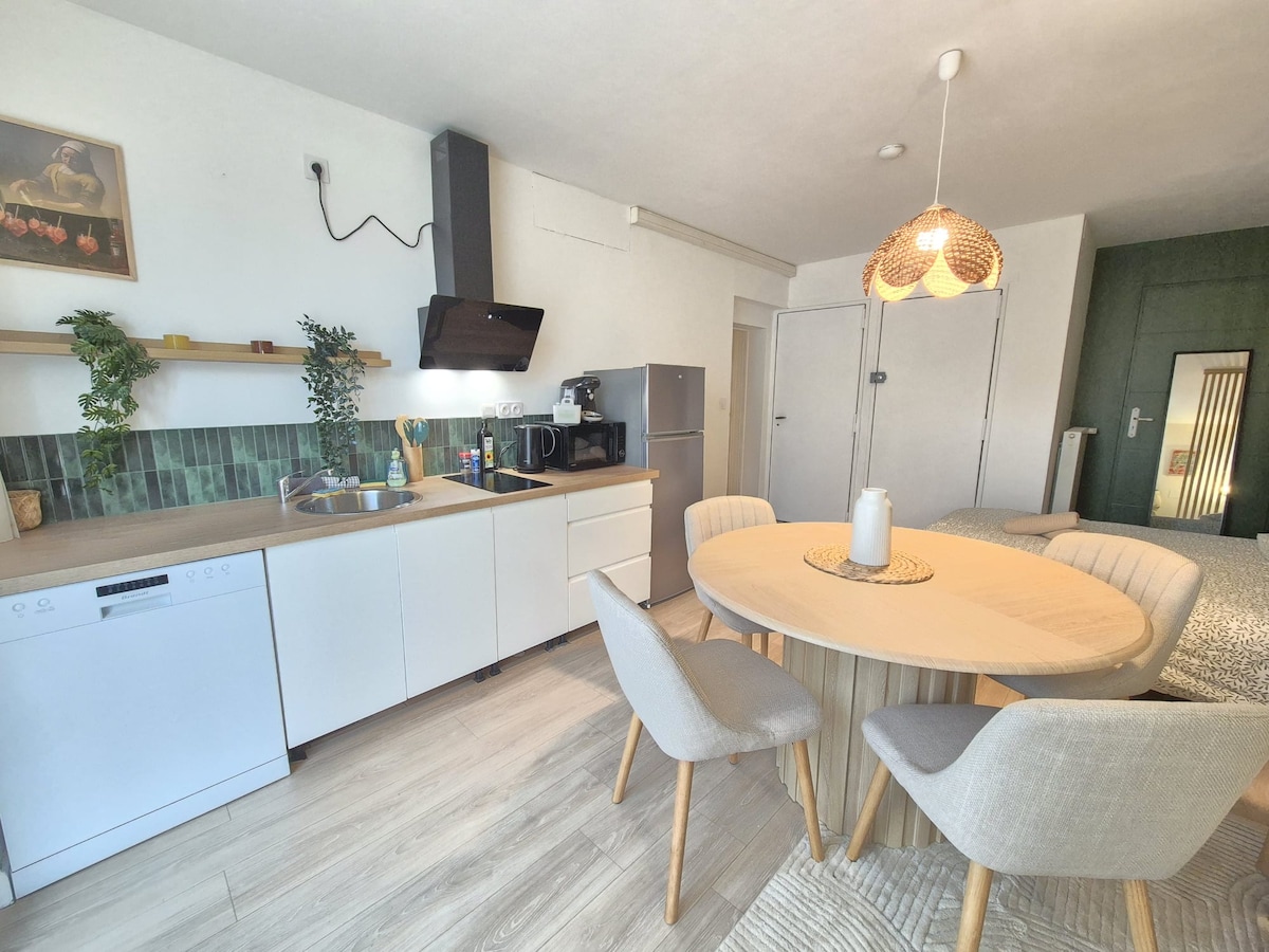 ¡Le damos la bienvenida a nuestro encantador y acogedor departamento en Cournon-d’Auvergne! Ubicado a 5 minutos del Zénith de Cournon-d'Auvergne. Disfrute de una estancia relajante con estacionamiento cercano y fácil acceso al transporte público. Nuestro espacio, cuidadosamente diseñado, le ofrece toda la comodidad necesaria, además de una experiencia de lujo con un spa privado y una amplia ducha a ras de suelo. Disfrute de una pantalla plana de 200 cm para una experiencia cinematográfica inmersiva.