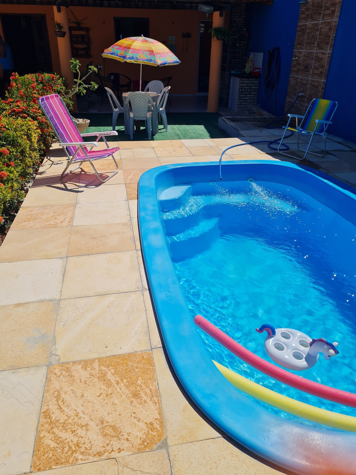 Excelente casa con amplio estacionamiento. Accesibilidad para silla de ruedas. Bar en la terraza con piscina (8,20X3,20), billar, parrilla, baño, ducha exterior, mesa para 8 personas. Balcón con sofá, mesa de 12 plazas, espacio para varias redes. Cocina americana completa con vajilla y utensilios, mesa para 6 personas, microondas, nevera, heladera, sandwichera, licuadora, batidora y cocina. Sala con TV y sofá. 03 dormitorios, 02 de los cuales son dobles y 01 con 03 camas individuales. 02 baños internos.