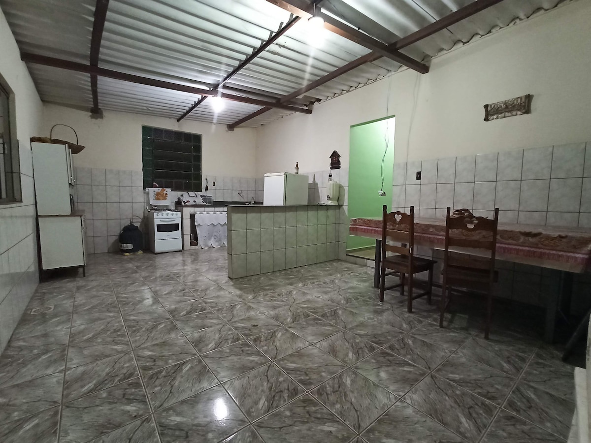Sitio/granja en condominio cerrado con casa de construcción rústica insertada en la naturaleza. Cuenta con 2 amplios dormitorios, 2 baños, sala enorme con cocina americana, piscina con ducha. Mucho confort y Comodidad junto a la naturaleza. También cuenta con una cocina con ollas eléctricas a presión, arrocera y freidora de aire, cafetera y sandwichera para el café, copas de vino para un momento más acogedor junto a la chimenea ecológica y chimenea de leña en la que proporcionamos la leña, y el fuego de tierra.