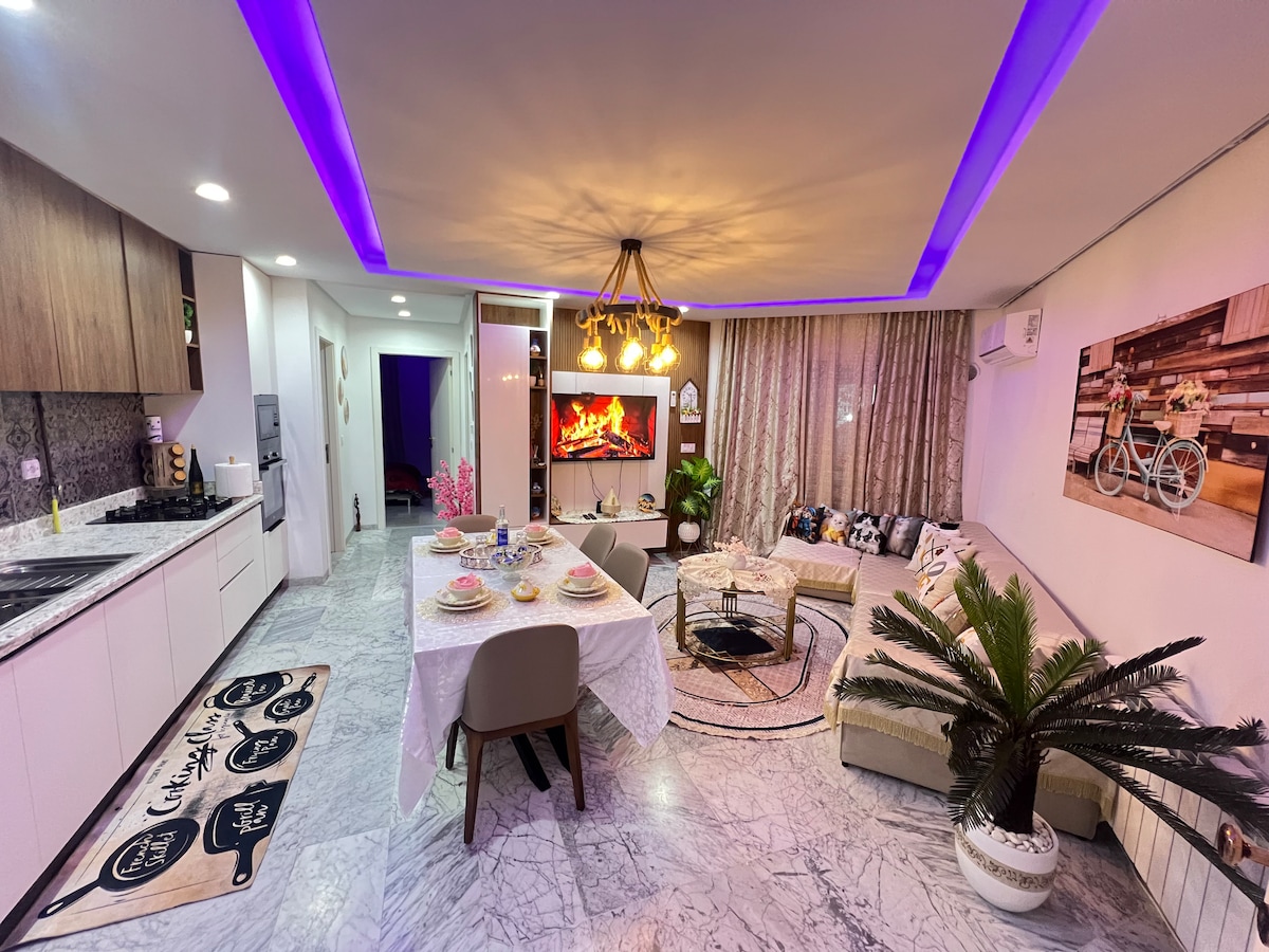 Relájese en este magnífico apartamento tranquilo y elegante en Hammamet. Situado a 5 minutos a pie de una de las mejores playas de Hammamet (Hotel Nahrawess), así como de los cafés, hoteles y restaurantes más populares de la zona. El alojamiento también dispone de una plaza de aparcamiento privada y vigilada por cámara y vigilante.