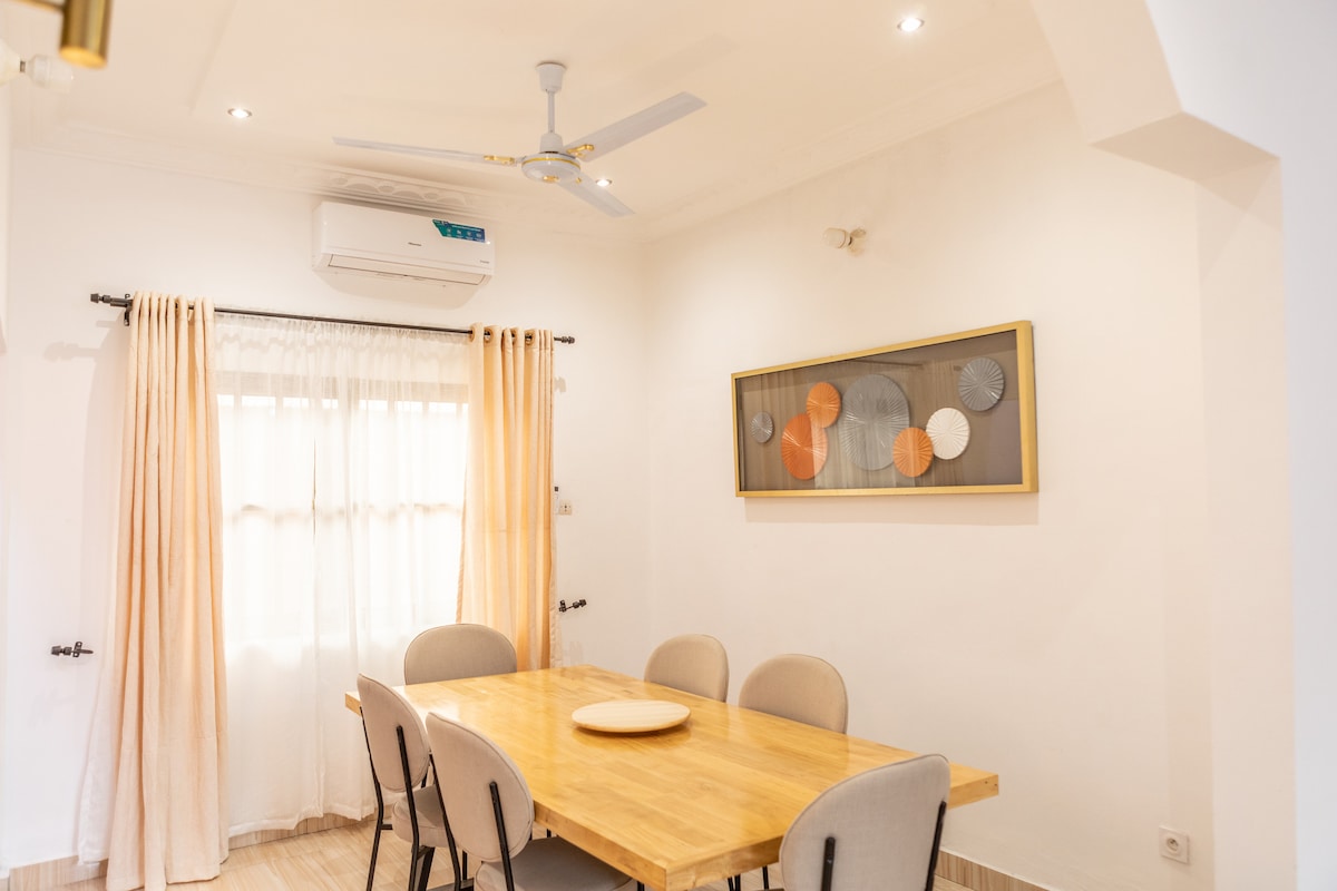 Desconectate de las preocupaciones en este alojamiento tan amplio y sereno. Este apartamento ofrece unas vacaciones relajantes para toda la familia. Situado en el corazón de la ciudad de Cotonou, está totalmente climatizado con sus dos dormitorios amueblados y cómodos, tiene un balcón y una terraza bien ventilada. La propiedad ofrece un servicio de traslado desde y hacia el aeropuerto. La conexión wifi es gratuita con televisores inteligentes conectados. También disponemos de un generador automático que sirve como relé.