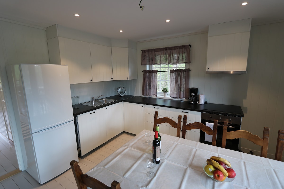 Tómate unas vacaciones con familiares o amigos en este lugar tranquilo. Vista al gran jardín y al lago. Dos dormitorios, uno con una cama doble y otro con camas individuales. Baño con lavabo, ducha, inodoro, secadora de toallas. Agua de pozo privado. Sala de estar combinada - cocina. Sala de estar con sofá y sillas. Cocina bien equipada con una gran zona de comedor. Bomba de calor. Patio de azulejos con mesa y 4 sillas. Gran jardín con césped para jugar, cancha de bochas, playa propia. Espacio de estacionamiento gratuito privado designado. A pocos kilómetros de la panadería. Bergen 32 km, Os 7 km
