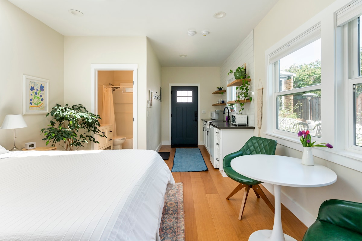 Todos son bienvenidos en nuestro tranquilo estudio con jardín. Es la parte trasera de nuestra casa histórica, ¡la estructura más antigua que se conserva en Berkeley! Estamos cerca de BART con fácil acceso a SF y UC Berkeley y a dos manzanas de la famosa zona comercial de Fourth Street de Berkeley con boutiques únicas, excelentes restaurantes y cafeterías. La entrada es privada y el jardín es todo tuyo para disfrutar.