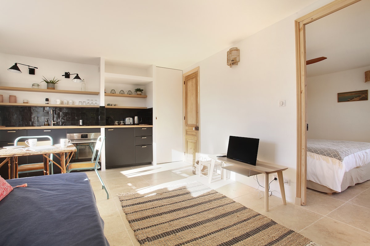 Casa unifamiliar de dos habitaciones de buen tamaño, acogedora con un jardín privado arbolado. Terraza grande de madera. Se encuentra en el corazón de la Provenza y a menos de 50 pasos de la orilla del mar, en una zona residencial y tranquila, cerca del centro de la ciudad Llegada autónoma Fibra y aire acondicionado 2 adultos solamente, acompañados de 1 o 2 niños Clasificación ministerial de 3 estrellas en la categoría de alojamientos turísticos amueblados otorgada por Provence Tourisme
