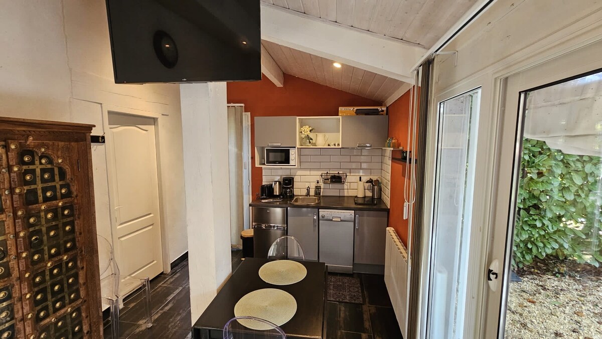 Relájese en este apartamento tranquilo y elegante, en una masía de Ardecha en medio de los viñedos, Una sala de estar con aire acondicionado con un sofá cama (= cama infantil y cuna y accesorios disponibles para bebés), un dormitorio, baño + terraza y jardín disponibles, En un pueblo tranquilo (tienda de comestibles, productores locales de verduras, frutas y vinos, mercado todos los domingos...), se encuentra a 10 minutos del río (baño, piragüismo...) y a unos 15 minutos de pueblos con más animación.