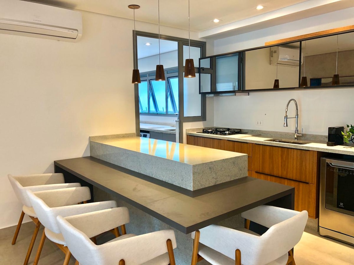 Increíble apartamento en un edificio nuevo, con una decoración sofisticada y funcional. Nuestra casa en invierno que ofrecemos a los huéspedes en verano. Aire acondicionado split. Wifi de 240 Mb. TV de 60" en la sala de estar y de 35" en las habitaciones. Cocina, horno eléctrico, microondas. Nevera y congelador. Cocina y despensa totalmente equipadas. Lavavajillas, lavadora/secadora. 1 suite con cama Queen y un dormitorio con baño y dos camas box. Balcón gourmet cerrado con vidrio, con parrilla y nevera extra para bebidas.