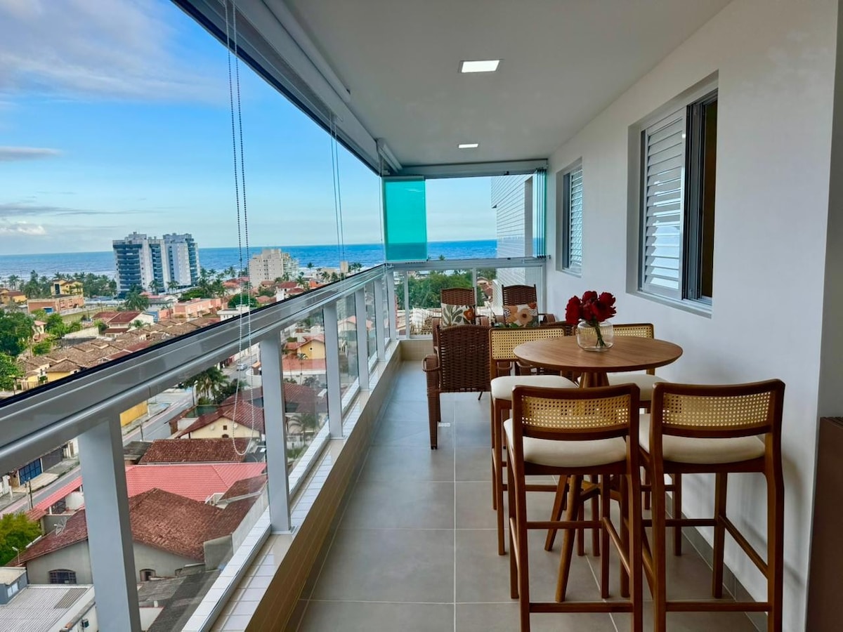 La casa está frente a la playa, nuestro apartamento tiene un balcón orientado al sur, se puede ver el amanecer en verano (alrededor de las 5:30 a. m.), desde el balcual disfrutar de la puesta de sol en dirección a los acantilados de «Serra do Mar», dormitorios y sala de estar con sistema de aire acondicionado, el condominio ofrece una sombrilla con sillas (cuatro) en la playa, además de una piscina, sauna, cancha deportiva, gimnasio y sala de juegos. Un ambiente agradable para relajarse, descansar, disfrutar de la naturaleza, las vistas, la vida y escuchar el sonido de las olas.