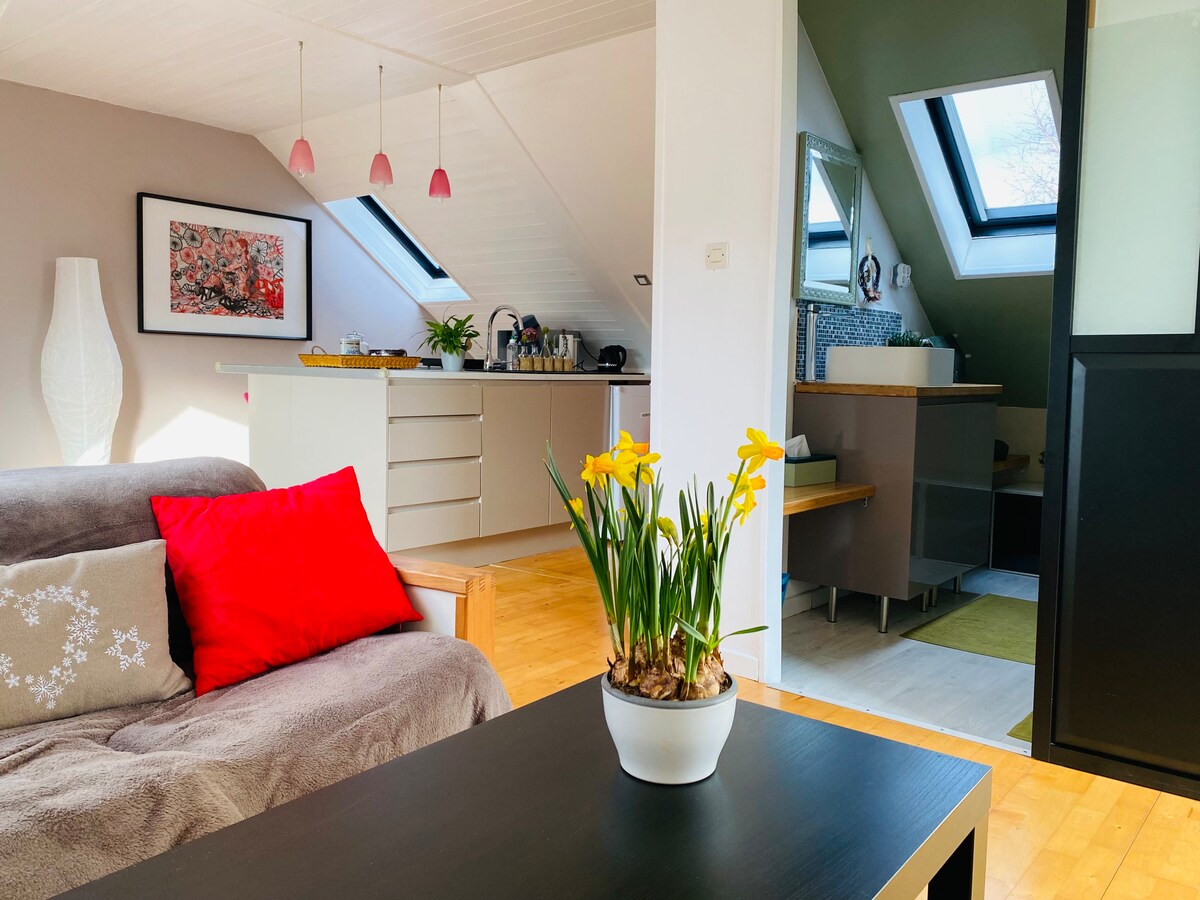 Estudio luminoso con un ambiente acogedor, que cuenta con un jardín privado, a la entrada de la vía verde que atraviesa el bosque de Marchiennes. El lugar es tranquilo y verde, aunque cerca de las metrópolis de Lille y Bruselas por la autopista o el tren.