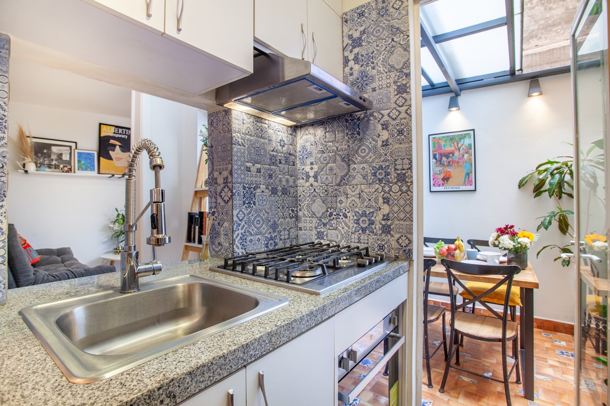 Descubre la Ciudad desde este pequeño y acogedor oasis. Un espacio lleno de luz y con detalles que te harán sentir en México. El lugar es muy tranquilo y el departamento amorosamente decorado. Como anfitrión podemos apoyarte en lo que requieras, no dudes en preguntar y si está en nuestras manos con gusto lo haremos. Techos altos, vigas de madera y pisos de pasta, un loft con mucho carácter. La cocina está totalmente equipada y el baño y su tina es una manera ideal de terminar el día.