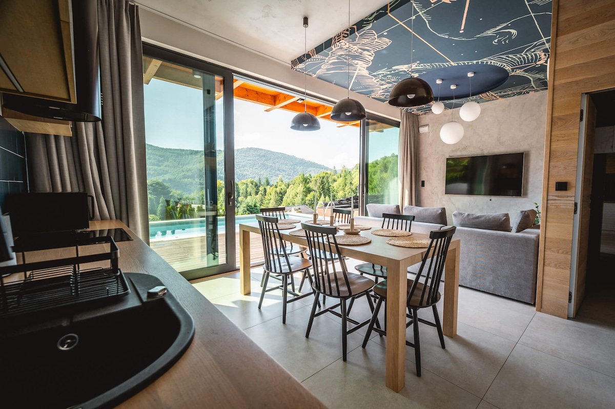 El paraíso de Beskids es un lugar para una escapada de vacaciones personalizada. Ubicado en una ladera de una montaña con una hermosa vista de las montañas Beskydy y un cielo nocturno estrellado. El lugar ofrece muchas comodidades, como: una piscina al aire libre que crece desde una ladera con una hermosa vista de las montañas, una cocina de verano, un cine de verano, una bañera de hidromasaje y una terraza en la azotea con un telescopio para aquellos que quieren mirar el cielo y las tumbonas para aquellos que buscan relajarse.