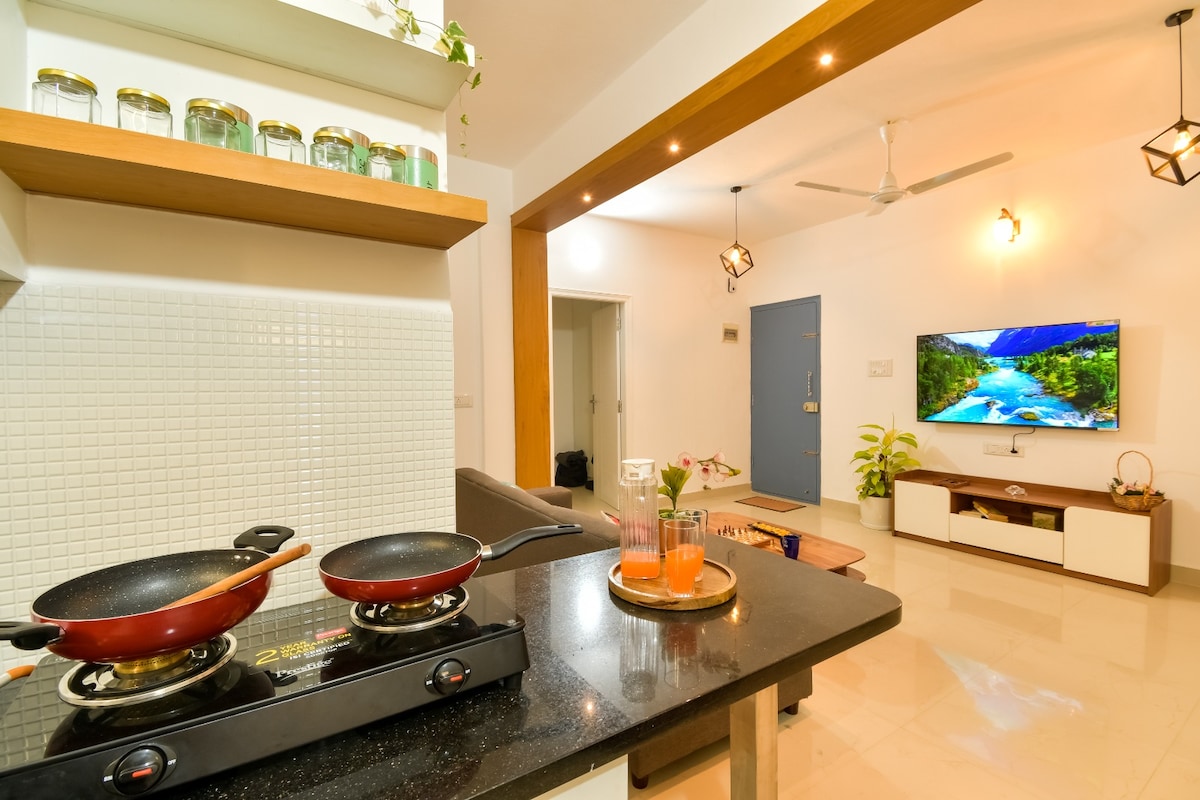 Stay in a naturally cool, quiet 2BHK near Doddagubbi Lake surrounded by trees, fresh air & balcony space, comfortable even in summer. • 300m to lake & park (perfect for walks, runs, birdwatching) • Close to Oia, Byg Brewsky, Gylt, Bhartiya City & cafes • Fast WiFi (125 Mbps) + dedicated workspace (desktop) • Balcony sit-out, fully equipped kitchen & cozy living area • Gym & kids’ pool in the building • Air cooler provided for added comfort