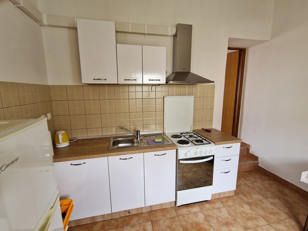 Es un espacioso y cómodo loft en el primer piso de la casa familiar. Dos dormitorios con camas dobles y una gran terraza. (90 m2) Se adapta cómodamente a cinco personas, situado en una calle tranquila, a 300 m, a cinco minutos a pie de la playa. Disfruta de Vodice, gente frendly, buena comida y muchas atracciones.